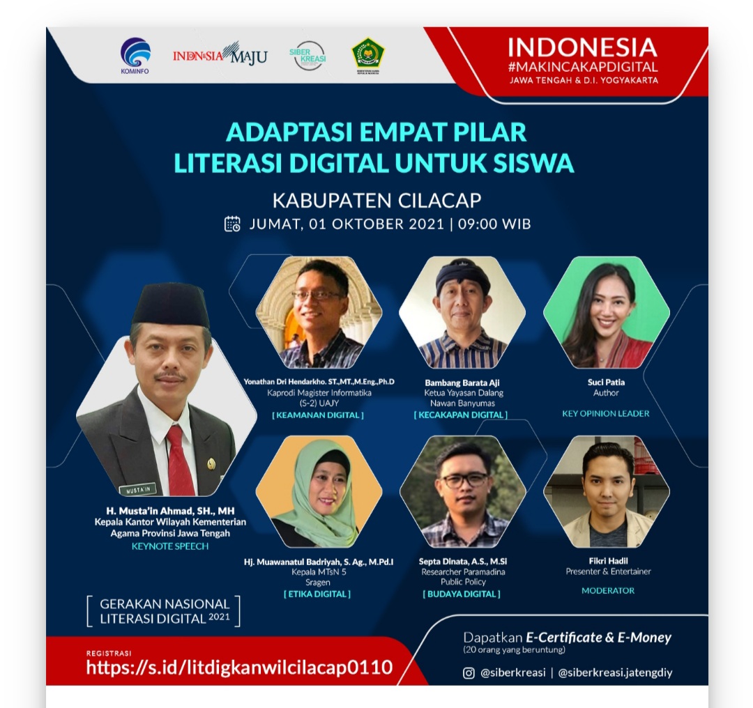 “Kondisi kita, literasi digital Indonesia saat ini pun berada pada peringkat 56 dari 63 negara padahal dari survei, orang Indonesia mengakses internet rata-rata 8 jam 52 menit,” kata dia. Webinar ini juga menghadirkan narasumber lain seperti Kepala MTsN 5 Sragen Muawanatul Badriyah, peneliti kebijakan publik Paramadina Septa Dinata serta dimoderatori Filari Hadil juga Suci Patia selaku key opinion leader.