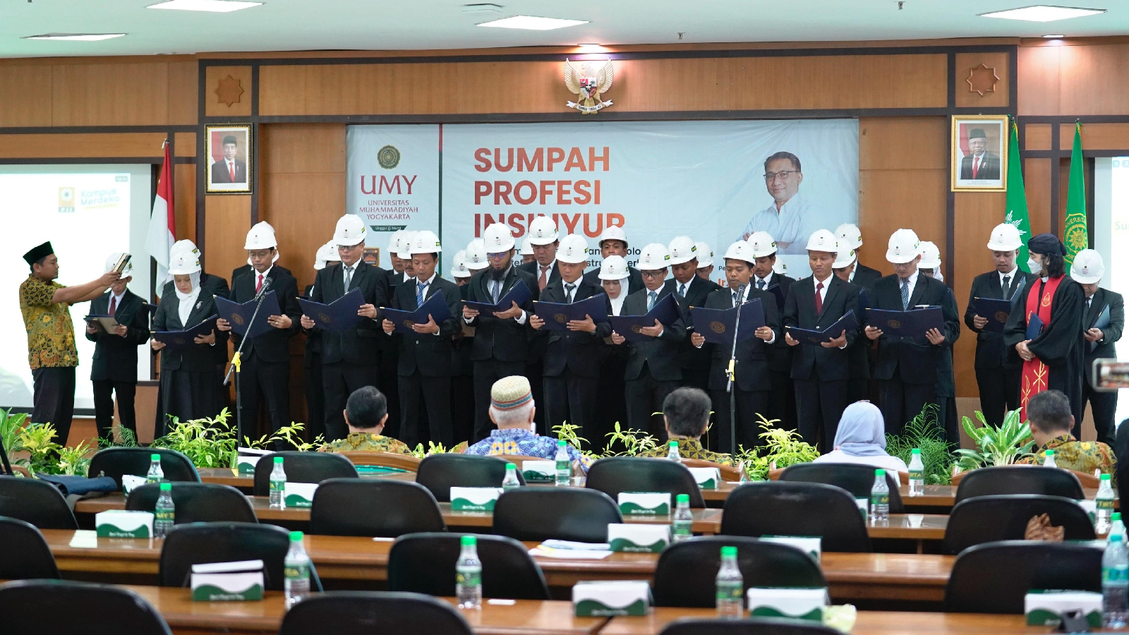 WARTAJOGJA.ID: Program Studi Profesi Insinyur (PS PPI) Universitas Muhammadiyah Yogyakarta (UMY) kembali mengambil sumpah 38 Insinyur baru di Gedung AR Fakhruddin B lantai 5 UMY, Sabtu (9/3). Ir. Dandung Sri Harninto, ST., MT., IPU., ASEAN Eng., Wakil Sekretaris Jenderal Persatuan Insinyur Indonesia (PII) Pusat yang hadir secara daring memberikan pesan untuk selalu menjaga lingkungan.