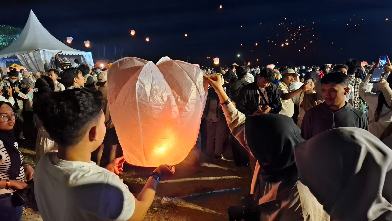 Caption - Pengunjung terlihat antusias sesaat sebelum penerbangan lampion serentak dilakukan secara bersamaan di Laguna View Pantai Depok. (Foto: Hendro SB/Warta Jogja)